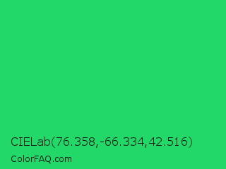 CIELab 76.358,-66.334,42.516 Color is a normal green color and the nearest color is UFO Green #3cd070. Hex code #22d869 and RGB value is rgb(34,216,105). In RGB color space, this color is composed of 13% red, 85% green, 41% blue, In CMYK color space, this color is composed of 84% cyan, 0% magenta, 51% yellow , 15% black , In HSL color space, this color has a hue angle of 143° , 73% saturation and 49% lightness.