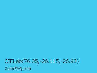 CIELab 76.35,-26.115,-26.93 Color is a normal cyan color and the nearest color is Picton Blue #45b1e8. Hex code #42cced and RGB value is rgb(66,204,237). In RGB color space, this color is composed of 26% red, 80% green, 93% blue, In CMYK color space, this color is composed of 72% cyan, 14% magenta, 0% yellow , 7% black , In HSL color space, this color has a hue angle of 192° , 83% saturation and 59% lightness.