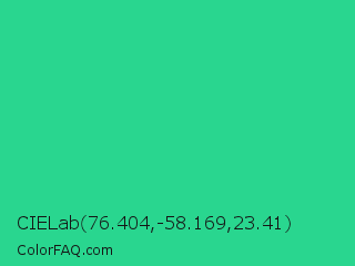 CIELab 76.404,-58.169,23.41 Color is a normal green color and the nearest color is Shamrock #33cc99. Hex code #29d68f and RGB value is rgb(41,214,143). In RGB color space, this color is composed of 16% red, 84% green, 56% blue, In CMYK color space, this color is composed of 81% cyan, 0% magenta, 33% yellow , 16% black , In HSL color space, this color has a hue angle of 155° , 68% saturation and 50% lightness.