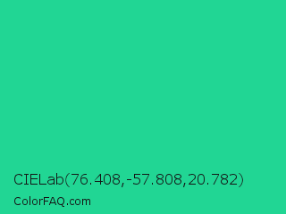 CIELab 76.408,-57.808,20.782 Color is a normal green color and the nearest color is Shamrock #33cc99. Hex code #21d694 and RGB value is rgb(33,214,148). In RGB color space, this color is composed of 13% red, 84% green, 58% blue, In CMYK color space, this color is composed of 85% cyan, 0% magenta, 31% yellow , 16% black , In HSL color space, this color has a hue angle of 158° , 73% saturation and 48% lightness.