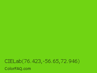 CIELab 76.423,-56.65,72.946 Color is a normal green color and the nearest color is Lima #76bd17. Hex code #70d413 and RGB value is rgb(112,212,19). In RGB color space, this color is composed of 44% red, 83% green, 7% blue, In CMYK color space, this color is composed of 47% cyan, 0% magenta, 91% yellow , 17% black , In HSL color space, this color has a hue angle of 91° , 84% saturation and 45% lightness.