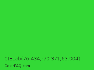 CIELab 76.434,-70.371,63.904 Color is a normal green color and the nearest color is Lime Green #32cd32. Hex code #33d936 and RGB value is rgb(51,217,54). In RGB color space, this color is composed of 20% red, 85% green, 21% blue, In CMYK color space, this color is composed of 76% cyan, 0% magenta, 75% yellow , 15% black , In HSL color space, this color has a hue angle of 121° , 69% saturation and 53% lightness.
