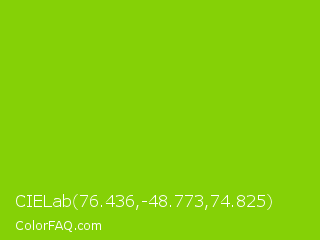 CIELab 76.436,-48.773,74.825 Color is a normal green color and the nearest color is Sheen Green #8fd400. Hex code #85d106 and RGB value is rgb(133,209,6). In RGB color space, this color is composed of 52% red, 82% green, 2% blue, In CMYK color space, this color is composed of 36% cyan, 0% magenta, 97% yellow , 18% black , In HSL color space, this color has a hue angle of 82° , 94% saturation and 42% lightness.