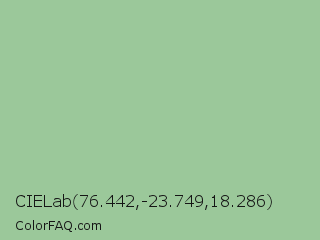 CIELab 76.442,-23.749,18.286 Color is a light green color and the nearest color is Eton Blue #96c8a2. Hex code #9bc89a and RGB value is rgb(155,200,154). In RGB color space, this color is composed of 61% red, 78% green, 60% blue, In CMYK color space, this color is composed of 23% cyan, 0% magenta, 23% yellow , 22% black , In HSL color space, this color has a hue angle of 119° , 29% saturation and 69% lightness.