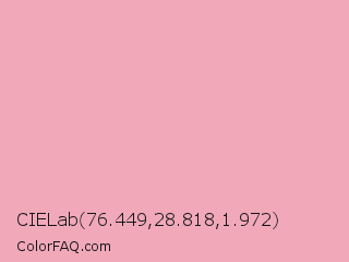 CIELab 76.449,28.818,1.972 Color is a light red color and the nearest color is Amaranth Pink #f19cbb. Hex code #f1a9ba and RGB value is rgb(241,169,186). In RGB color space, this color is composed of 95% red, 66% green, 73% blue, In CMYK color space, this color is composed of 0% cyan, 30% magenta, 23% yellow , 5% black , In HSL color space, this color has a hue angle of 346° , 72% saturation and 80% lightness.