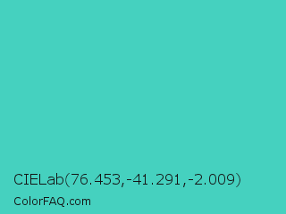 CIELab 76.453,-41.291,-2.009 Color is a normal cyan color and the nearest color is Medium Turquoise #48d1cc. Hex code #45d1bf and RGB value is rgb(69,209,191). In RGB color space, this color is composed of 27% red, 82% green, 75% blue, In CMYK color space, this color is composed of 67% cyan, 0% magenta, 9% yellow , 18% black , In HSL color space, this color has a hue angle of 172° , 60% saturation and 55% lightness.