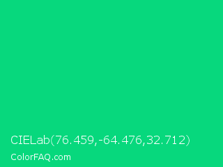 CIELab 76.459,-64.476,32.712 Color is a normal green color and the nearest color is Caribbean Green #00cc99. Hex code #07d87d and RGB value is rgb(7,216,125). In RGB color space, this color is composed of 3% red, 85% green, 49% blue, In CMYK color space, this color is composed of 97% cyan, 0% magenta, 42% yellow , 15% black , In HSL color space, this color has a hue angle of 154° , 94% saturation and 44% lightness.