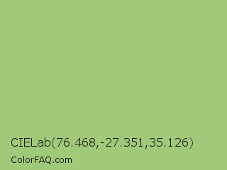 CIELab 76.468,-27.351,35.126 Color is a light green color and the nearest color is Pistachio #93c572. Hex code #a0c97a and RGB value is rgb(160,201,122). In RGB color space, this color is composed of 63% red, 79% green, 48% blue, In CMYK color space, this color is composed of 20% cyan, 0% magenta, 39% yellow , 21% black , In HSL color space, this color has a hue angle of 91° , 42% saturation and 63% lightness.