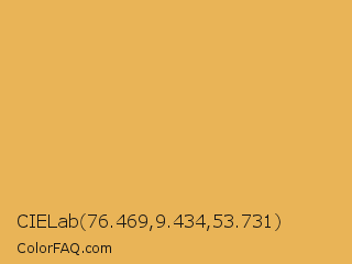 CIELab 76.469,9.434,53.731 Color is a light orange color and the nearest color is Sunray #e3ab57. Hex code #e9b457 and RGB value is rgb(233,180,87). In RGB color space, this color is composed of 91% red, 71% green, 34% blue, In CMYK color space, this color is composed of 0% cyan, 23% magenta, 63% yellow , 9% black , In HSL color space, this color has a hue angle of 38° , 77% saturation and 63% lightness.