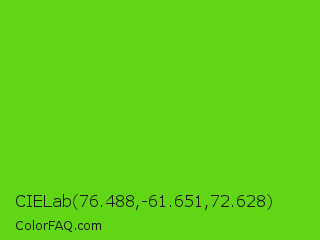 CIELab 76.488,-61.651,72.628 Color is a normal green color and the nearest color is Harlequin Green #46cb18. Hex code #61d614 and RGB value is rgb(97,214,20). In RGB color space, this color is composed of 38% red, 84% green, 8% blue, In CMYK color space, this color is composed of 55% cyan, 0% magenta, 91% yellow , 16% black , In HSL color space, this color has a hue angle of 96° , 83% saturation and 46% lightness.