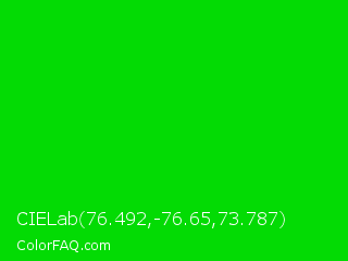 CIELab 76.492,-76.65,73.787 Color is a normal green color and the nearest color is Green #00ff00. Hex code #03db04 and RGB value is rgb(3,219,4). In RGB color space, this color is composed of 1% red, 86% green, 2% blue, In CMYK color space, this color is composed of 99% cyan, 0% magenta, 98% yellow , 14% black , In HSL color space, this color has a hue angle of 120° , 97% saturation and 44% lightness.