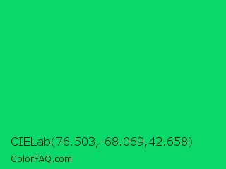 CIELab 76.503,-68.069,42.658 Color is a normal green color and the nearest color is Malachite #0bda51. Hex code #0ad969 and RGB value is rgb(10,217,105). In RGB color space, this color is composed of 4% red, 85% green, 41% blue, In CMYK color space, this color is composed of 95% cyan, 0% magenta, 52% yellow , 15% black , In HSL color space, this color has a hue angle of 148° , 91% saturation and 45% lightness.