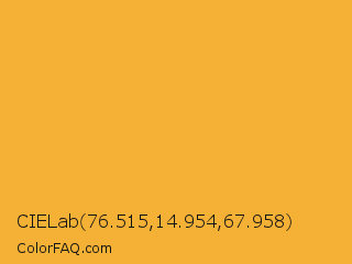 CIELab 76.515,14.954,67.958 Color is a normal orange color and the nearest color is Tulip Tree #eab33b. Hex code #f5b036 and RGB value is rgb(245,176,54). In RGB color space, this color is composed of 96% red, 69% green, 21% blue, In CMYK color space, this color is composed of 0% cyan, 28% magenta, 78% yellow , 4% black , In HSL color space, this color has a hue angle of 38° , 91% saturation and 59% lightness.