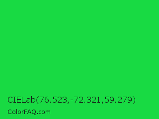 CIELab 76.523,-72.321,59.279 Color is a normal green color and the nearest color is Malachite #0bda51. Hex code #18da43 and RGB value is rgb(24,218,67). In RGB color space, this color is composed of 9% red, 85% green, 26% blue, In CMYK color space, this color is composed of 89% cyan, 0% magenta, 69% yellow , 15% black , In HSL color space, this color has a hue angle of 133° , 80% saturation and 47% lightness.