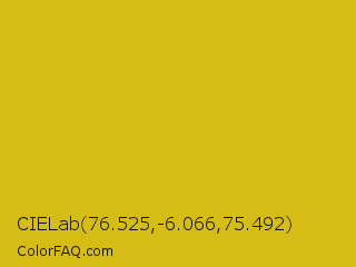 CIELab 76.525,-6.066,75.492 Color is a normal yellow color and the nearest color is Gold Tips #deba13. Hex code #d6bd15 and RGB value is rgb(214,189,21). In RGB color space, this color is composed of 84% red, 74% green, 8% blue, In CMYK color space, this color is composed of 0% cyan, 12% magenta, 90% yellow , 16% black , In HSL color space, this color has a hue angle of 52° , 82% saturation and 46% lightness.