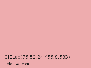 CIELab 76.52,24.456,8.583 Color is a light red color and the nearest color is Shilo #e8b9b3. Hex code #eeacae and RGB value is rgb(238,172,174). In RGB color space, this color is composed of 93% red, 67% green, 68% blue, In CMYK color space, this color is composed of 0% cyan, 28% magenta, 27% yellow , 7% black , In HSL color space, this color has a hue angle of 358° , 66% saturation and 80% lightness.