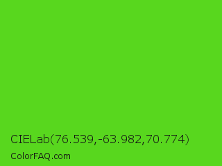 CIELab 76.539,-63.982,70.774 Color is a normal green color and the nearest color is Harlequin Green #46cb18. Hex code #58d71e and RGB value is rgb(88,215,30). In RGB color space, this color is composed of 35% red, 84% green, 12% blue, In CMYK color space, this color is composed of 59% cyan, 0% magenta, 86% yellow , 16% black , In HSL color space, this color has a hue angle of 101° , 76% saturation and 48% lightness.