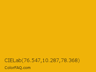CIELab 76.547,10.287,78.368 Color is a normal orange color and the nearest color is Corn #e7bf05. Hex code #f0b308 and RGB value is rgb(240,179,8). In RGB color space, this color is composed of 94% red, 70% green, 3% blue, In CMYK color space, this color is composed of 0% cyan, 25% magenta, 97% yellow , 6% black , In HSL color space, this color has a hue angle of 44° , 94% saturation and 49% lightness.