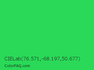 CIELab 76.571,-68.197,50.677 Color is a normal green color and the nearest color is UFO Green #3cd070. Hex code #2ad958 and RGB value is rgb(42,217,88). In RGB color space, this color is composed of 16% red, 85% green, 35% blue, In CMYK color space, this color is composed of 81% cyan, 0% magenta, 59% yellow , 15% black , In HSL color space, this color has a hue angle of 136° , 70% saturation and 51% lightness.