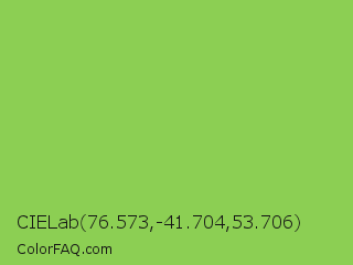 CIELab 76.573,-41.704,53.706 Color is a normal green color and the nearest color is Dollar Bill #85bb65. Hex code #8ccf53 and RGB value is rgb(140,207,83). In RGB color space, this color is composed of 55% red, 81% green, 33% blue, In CMYK color space, this color is composed of 32% cyan, 0% magenta, 60% yellow , 19% black , In HSL color space, this color has a hue angle of 92° , 56% saturation and 57% lightness.