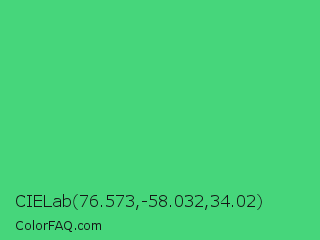 CIELab 76.573,-58.032,34.02 Color is a normal green color and the nearest color is UFO Green #3cd070. Hex code #46d67b and RGB value is rgb(70,214,123). In RGB color space, this color is composed of 27% red, 84% green, 48% blue, In CMYK color space, this color is composed of 67% cyan, 0% magenta, 43% yellow , 16% black , In HSL color space, this color has a hue angle of 142° , 64% saturation and 56% lightness.