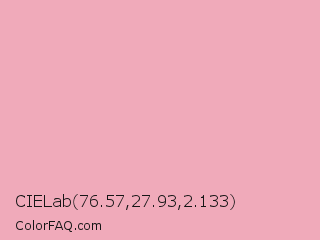 CIELab 76.57,27.93,2.133 Color is a light red color and the nearest color is Nadeshiko Pink #f6adc6. Hex code #f0aaba and RGB value is rgb(240,170,186). In RGB color space, this color is composed of 94% red, 67% green, 73% blue, In CMYK color space, this color is composed of 0% cyan, 29% magenta, 23% yellow , 6% black , In HSL color space, this color has a hue angle of 346° , 70% saturation and 80% lightness.