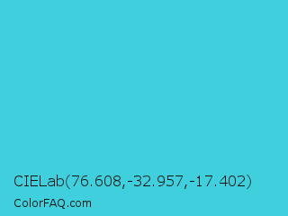 CIELab 76.608,-32.957,-17.402 Color is a normal cyan color and the nearest color is Medium Turquoise #48d1cc. Hex code #40cfdc and RGB value is rgb(64,207,220). In RGB color space, this color is composed of 25% red, 81% green, 86% blue, In CMYK color space, this color is composed of 71% cyan, 6% magenta, 0% yellow , 14% black , In HSL color space, this color has a hue angle of 185° , 69% saturation and 56% lightness.