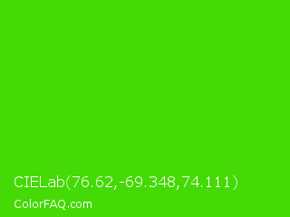 CIELab 76.62,-69.348,74.111 Color is a normal green color and the nearest color is Harlequin Green #46cb18. Hex code #45d905 and RGB value is rgb(69,217,5). In RGB color space, this color is composed of 27% red, 85% green, 2% blue, In CMYK color space, this color is composed of 68% cyan, 0% magenta, 98% yellow , 15% black , In HSL color space, this color has a hue angle of 102° , 95% saturation and 44% lightness.