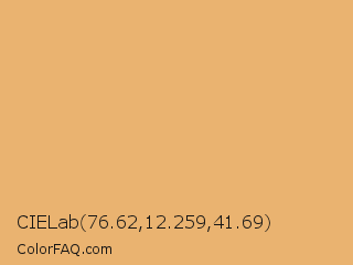 CIELab 76.62,12.259,41.69 Color is a light orange color and the nearest color is Middle Yellow Red #ecb176. Hex code #eab370 and RGB value is rgb(234,179,112). In RGB color space, this color is composed of 92% red, 70% green, 44% blue, In CMYK color space, this color is composed of 0% cyan, 24% magenta, 52% yellow , 8% black , In HSL color space, this color has a hue angle of 33° , 74% saturation and 68% lightness.