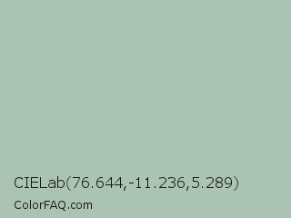 CIELab 76.644,-11.236,5.289 Color is a light green color and the nearest color is Spring Rain #accbb1. Hex code #abc3b3 and RGB value is rgb(171,195,179). In RGB color space, this color is composed of 67% red, 76% green, 70% blue, In CMYK color space, this color is composed of 12% cyan, 0% magenta, 8% yellow , 24% black , In HSL color space, this color has a hue angle of 140° , 17% saturation and 72% lightness.