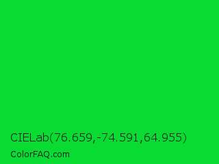 CIELab 76.659,-74.591,64.955 Color is a normal green color and the nearest color is Vivid Malachite #00cc33. Hex code #0adb33 and RGB value is rgb(10,219,51). In RGB color space, this color is composed of 4% red, 86% green, 20% blue, In CMYK color space, this color is composed of 95% cyan, 0% magenta, 77% yellow , 14% black , In HSL color space, this color has a hue angle of 132° , 91% saturation and 45% lightness.