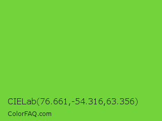 CIELab 76.661,-54.316,63.356 Color is a normal green color and the nearest color is Kiwi #8ee53f. Hex code #72d43a and RGB value is rgb(114,212,58). In RGB color space, this color is composed of 45% red, 83% green, 23% blue, In CMYK color space, this color is composed of 46% cyan, 0% magenta, 73% yellow , 17% black , In HSL color space, this color has a hue angle of 98° , 64% saturation and 53% lightness.