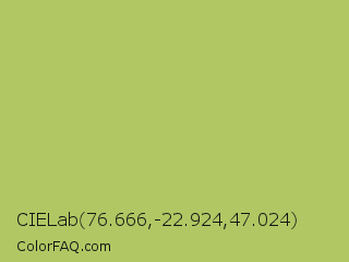 CIELab 76.666,-22.924,47.024 Color is a normal lime color and the nearest color is Middle Green Yellow #acbf60. Hex code #b0c763 and RGB value is rgb(176,199,99). In RGB color space, this color is composed of 69% red, 78% green, 39% blue, In CMYK color space, this color is composed of 12% cyan, 0% magenta, 50% yellow , 22% black , In HSL color space, this color has a hue angle of 74° , 47% saturation and 58% lightness.