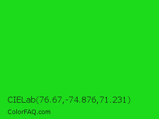 CIELab 76.67,-74.876,71.231 Color is a normal green color and the nearest color is Lime Green #32cd32. Hex code #1cdb1a and RGB value is rgb(28,219,26). In RGB color space, this color is composed of 11% red, 86% green, 10% blue, In CMYK color space, this color is composed of 87% cyan, 0% magenta, 88% yellow , 14% black , In HSL color space, this color has a hue angle of 119° , 79% saturation and 48% lightness.