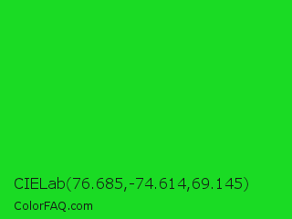 CIELab 76.685,-74.614,69.145 Color is a normal green color and the nearest color is Lime Green #32cd32. Hex code #1adb24 and RGB value is rgb(26,219,36). In RGB color space, this color is composed of 10% red, 86% green, 14% blue, In CMYK color space, this color is composed of 88% cyan, 0% magenta, 84% yellow , 14% black , In HSL color space, this color has a hue angle of 123° , 79% saturation and 48% lightness.