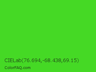 CIELab 76.694,-68.438,69.15 Color is a normal green color and the nearest color is Harlequin Green #46cb18. Hex code #45d925 and RGB value is rgb(69,217,37). In RGB color space, this color is composed of 27% red, 85% green, 15% blue, In CMYK color space, this color is composed of 68% cyan, 0% magenta, 83% yellow , 15% black , In HSL color space, this color has a hue angle of 109° , 71% saturation and 50% lightness.