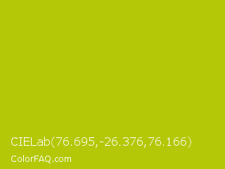 CIELab 76.695,-26.376,76.166 Color is a normal yellow color and the nearest color is Rio Grande #bbd009. Hex code #b4c807 and RGB value is rgb(180,200,7). In RGB color space, this color is composed of 71% red, 78% green, 3% blue, In CMYK color space, this color is composed of 10% cyan, 0% magenta, 97% yellow , 22% black , In HSL color space, this color has a hue angle of 66° , 93% saturation and 41% lightness.