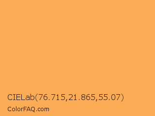 CIELab 76.715,21.865,55.07 Color is a light orange color and the nearest color is Texas Rose #ffb555. Hex code #fdac56 and RGB value is rgb(253,172,86). In RGB color space, this color is composed of 99% red, 67% green, 34% blue, In CMYK color space, this color is composed of 0% cyan, 32% magenta, 66% yellow , 1% black , In HSL color space, this color has a hue angle of 31° , 98% saturation and 66% lightness.