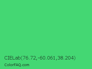CIELab 76.72,-60.061,38.204 Color is a normal green color and the nearest color is UFO Green #3cd070. Hex code #44d773 and RGB value is rgb(68,215,115). In RGB color space, this color is composed of 27% red, 84% green, 45% blue, In CMYK color space, this color is composed of 68% cyan, 0% magenta, 47% yellow , 16% black , In HSL color space, this color has a hue angle of 139° , 65% saturation and 55% lightness.