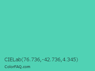 CIELab 76.736,-42.736,4.345 Color is a normal cyan color and the nearest color is Eucalyptus #44d7a8. Hex code #50d2b4 and RGB value is rgb(80,210,180). In RGB color space, this color is composed of 31% red, 82% green, 71% blue, In CMYK color space, this color is composed of 62% cyan, 0% magenta, 14% yellow , 18% black , In HSL color space, this color has a hue angle of 166° , 59% saturation and 57% lightness.