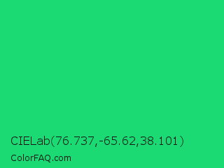 CIELab 76.737,-65.62,38.101 Color is a normal green color and the nearest color is UFO Green #3cd070. Hex code #1bd973 and RGB value is rgb(27,217,115). In RGB color space, this color is composed of 11% red, 85% green, 45% blue, In CMYK color space, this color is composed of 88% cyan, 0% magenta, 47% yellow , 15% black , In HSL color space, this color has a hue angle of 148° , 78% saturation and 48% lightness.