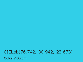 CIELab 76.742,-30.942,-23.673 Color is a normal cyan color and the nearest color is Scooter #2ebfd4. Hex code #31cfe8 and RGB value is rgb(49,207,232). In RGB color space, this color is composed of 19% red, 81% green, 91% blue, In CMYK color space, this color is composed of 79% cyan, 11% magenta, 0% yellow , 9% black , In HSL color space, this color has a hue angle of 188° , 80% saturation and 55% lightness.