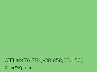 CIELab 76.751,-38.858,33.156 Color is a light green color and the nearest color is De York #7ac488. Hex code #85cf7e and RGB value is rgb(133,207,126). In RGB color space, this color is composed of 52% red, 81% green, 49% blue, In CMYK color space, this color is composed of 36% cyan, 0% magenta, 39% yellow , 19% black , In HSL color space, this color has a hue angle of 115° , 46% saturation and 65% lightness.