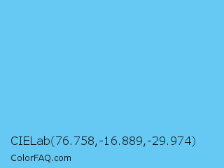 CIELab 76.758,-16.889,-29.974 Color is a light blue color and the nearest color is Maya Blue #73c2fb. Hex code #66c9f4 and RGB value is rgb(102,201,244). In RGB color space, this color is composed of 40% red, 79% green, 96% blue, In CMYK color space, this color is composed of 58% cyan, 18% magenta, 0% yellow , 4% black , In HSL color space, this color has a hue angle of 198° , 87% saturation and 68% lightness.