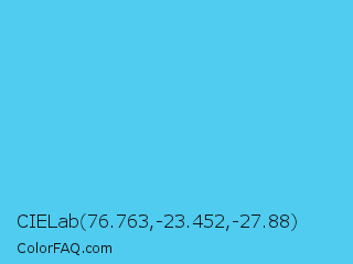 CIELab 76.763,-23.452,-27.88 Color is a light cyan color and the nearest color is Viking #64ccdb. Hex code #4fccf0 and RGB value is rgb(79,204,240). In RGB color space, this color is composed of 31% red, 80% green, 94% blue, In CMYK color space, this color is composed of 67% cyan, 15% magenta, 0% yellow , 6% black , In HSL color space, this color has a hue angle of 193° , 84% saturation and 63% lightness.