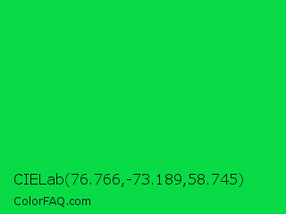 CIELab 76.766,-73.189,58.745 Color is a normal green color and the nearest color is Malachite #0bda51. Hex code #08db45 and RGB value is rgb(8,219,69). In RGB color space, this color is composed of 3% red, 86% green, 27% blue, In CMYK color space, this color is composed of 96% cyan, 0% magenta, 68% yellow , 14% black , In HSL color space, this color has a hue angle of 137° , 93% saturation and 45% lightness.