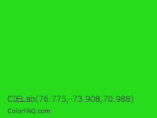 CIELab 76.775,-73.908,70.988 Color is a normal green color and the nearest color is Lime Green #32cd32. Hex code #26db1c and RGB value is rgb(38,219,28). In RGB color space, this color is composed of 15% red, 86% green, 11% blue, In CMYK color space, this color is composed of 83% cyan, 0% magenta, 87% yellow , 14% black , In HSL color space, this color has a hue angle of 117° , 77% saturation and 48% lightness.