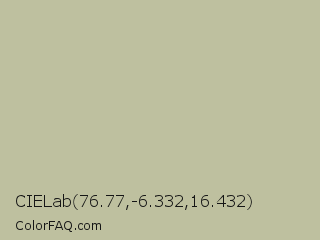 CIELab 76.77,-6.332,16.432 Color is a light yellow color and the nearest color is Coral Reef #c7bca2. Hex code #bec09f and RGB value is rgb(190,192,159). In RGB color space, this color is composed of 75% red, 75% green, 62% blue, In CMYK color space, this color is composed of 1% cyan, 0% magenta, 17% yellow , 25% black , In HSL color space, this color has a hue angle of 64° , 21% saturation and 69% lightness.