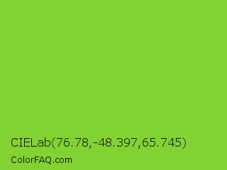 CIELab 76.78,-48.397,65.745 Color is a normal green color and the nearest color is Atlantis #97cd2d. Hex code #83d234 and RGB value is rgb(131,210,52). In RGB color space, this color is composed of 51% red, 82% green, 20% blue, In CMYK color space, this color is composed of 38% cyan, 0% magenta, 75% yellow , 18% black , In HSL color space, this color has a hue angle of 90° , 64% saturation and 51% lightness.