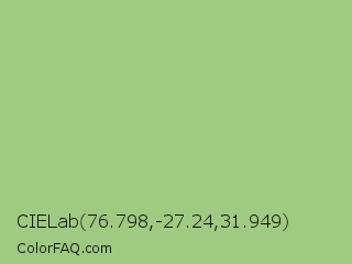 CIELab 76.798,-27.24,31.949 Color is a light green color and the nearest color is Pistachio #93c572. Hex code #9fca81 and RGB value is rgb(159,202,129). In RGB color space, this color is composed of 62% red, 79% green, 51% blue, In CMYK color space, this color is composed of 21% cyan, 0% magenta, 36% yellow , 21% black , In HSL color space, this color has a hue angle of 95° , 41% saturation and 65% lightness.